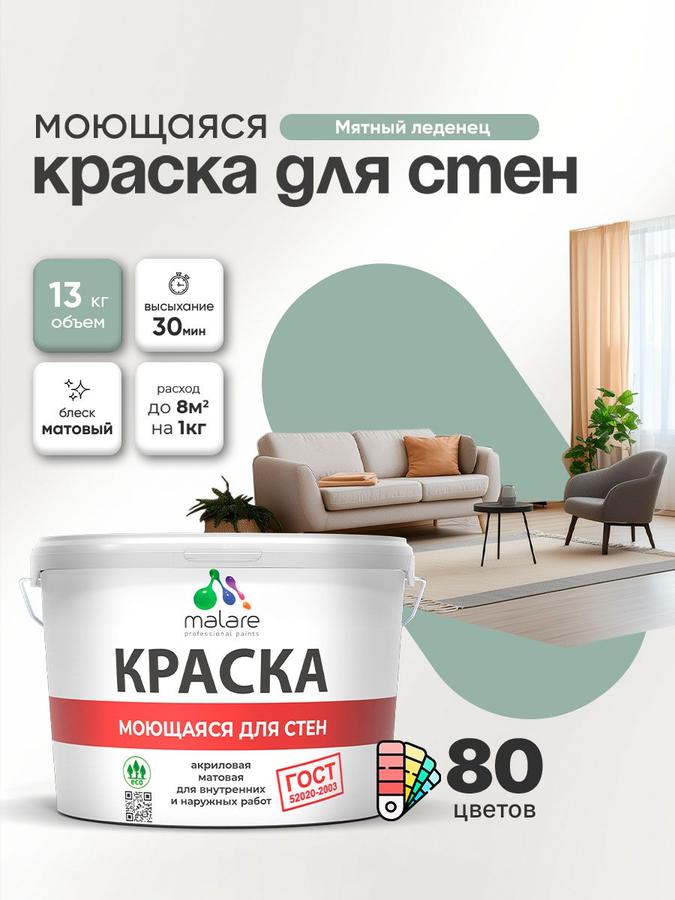 Акриловая моющаяся краска Malare ГОСТ матовая, мятный леденец, 9 л (13 кг), для стен, потолков и обоев, быстрая, без запаха, универсальная для внутр. и наруж. работ